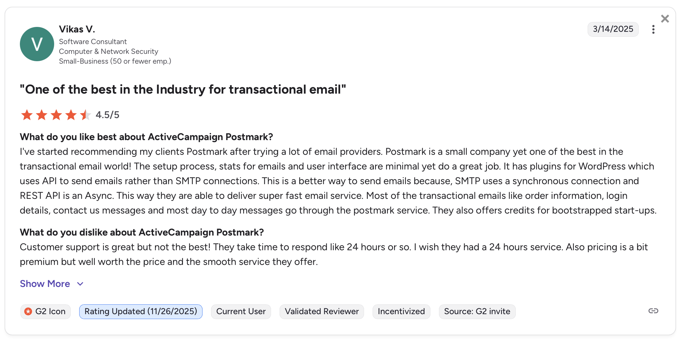 “One of the best in the industry for transactional email.” — G2 Review, Software Consultant, Computer and Network Security