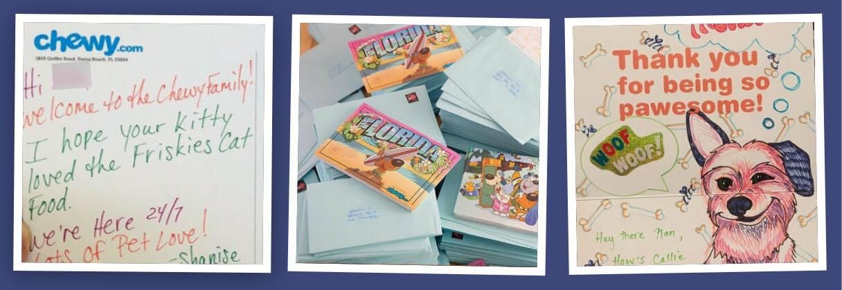 - Chewy treats customers like family and supports owners when their furry friends pass away. Company reps send them a miniature pet portrait or bouquet and a condolence note.