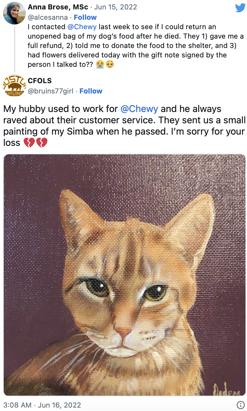 Chewy is an online pet food store with a customer-centric approach that is famous for its exceptional attention and empathy to customers. Here’s just a couple of stories about their service customer relationships: