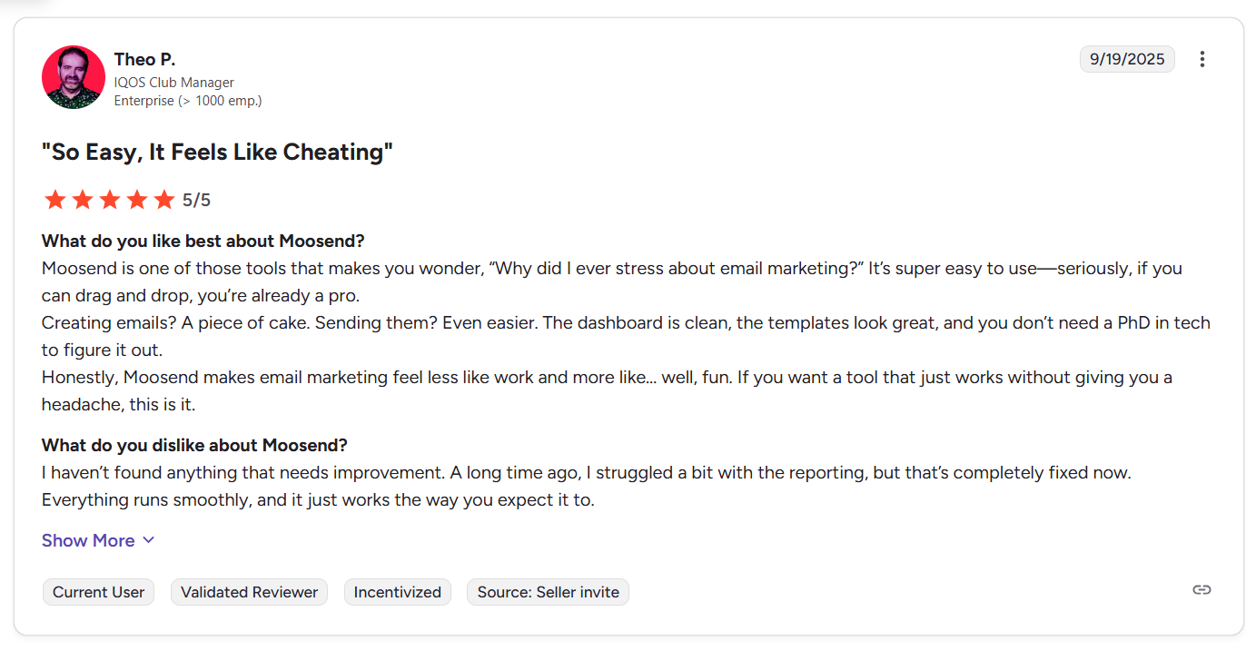 - Moosend is ideal for SMBs and marketers who want powerful automations, unlimited email sends, and an easy drag-and-drop editor at an affordable price.